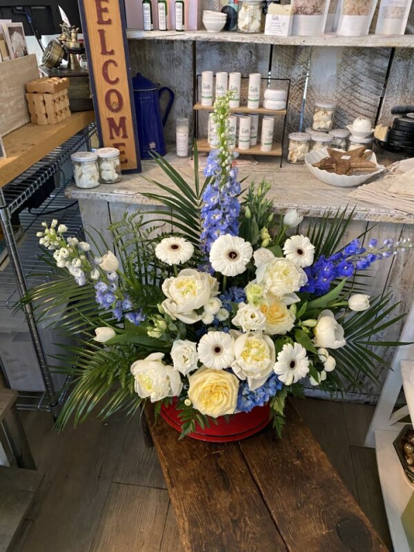 A sophisticated sympathy display for our loved ones, typically positioned at the forefront of the main table. There is an option of creating this arrangement to your colour preference.