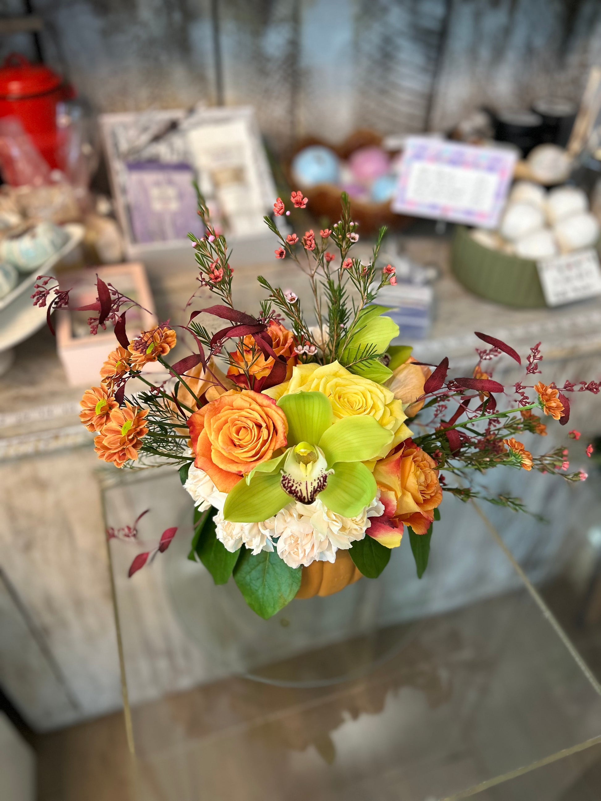 Create a cozy, warm atmosphere with this adorable floral pumpkin centerpiece — the perfect fall decoration! 🎃💐 Each arrangement is uniquely crafted with seasonal flowers selected by our designer based on availability, ensuring freshness and beauty. The colors and style will match the photo exactly. Your purchase includes a ceramic pumpkin container with a lid. Choose Standard (medium size), Deluxe (larger and fuller), or Premium (extra-large with abundant blooms) to make a stunning seasonal statement in your home. Don’t miss out on this charming autumn centerpiece!